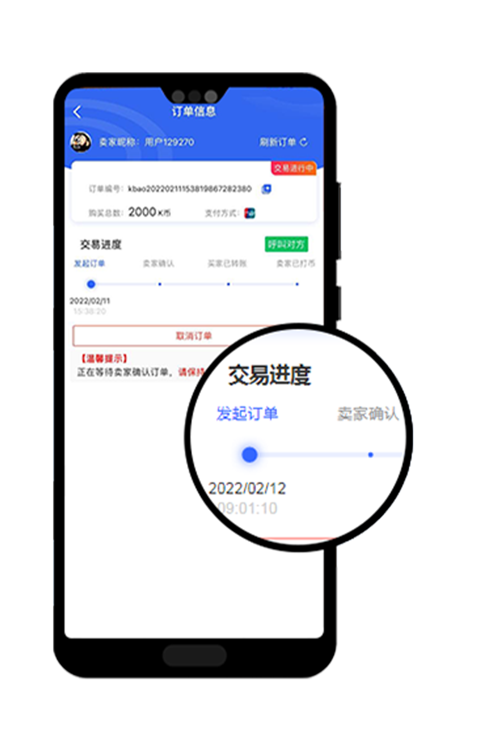 第五步:上传"支付凭证",并点击【我已转账】,等待卖家转币。